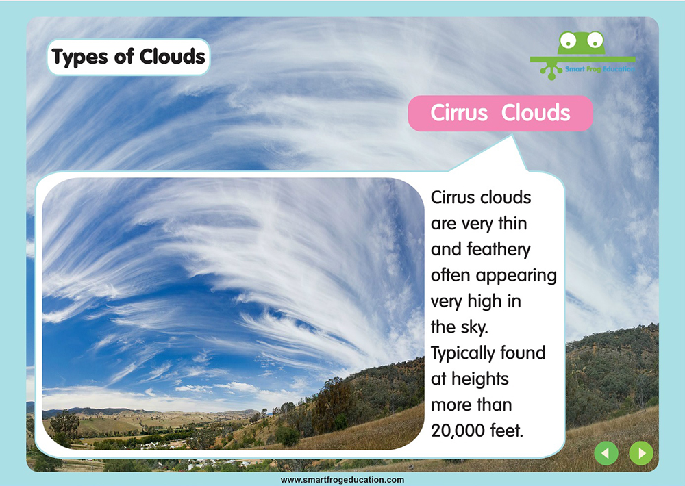 Go interactive. The clouds can be beautiful, but they are often mysterious to young learners. This go interactive resource combines breath-taking photos of different types of clouds with information about exactly what kind of clouds they are. Before you know it, your they’ll know the difference between cirrus and cumulus clouds!